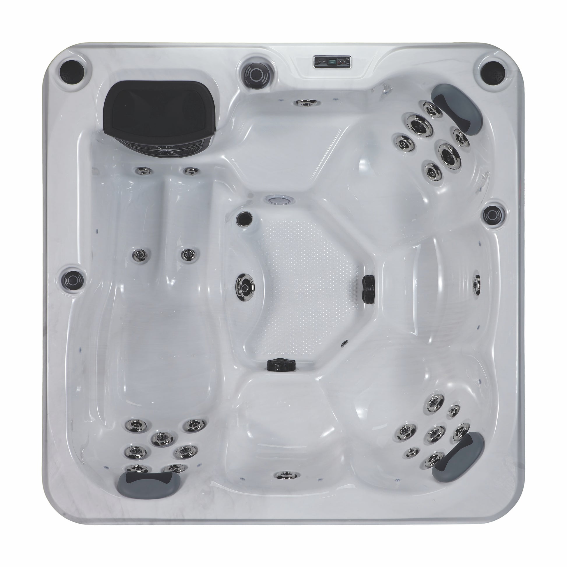 The sleek design with Sterling Silver acrylic bowl is combined with perimeter insulation for better heat retention and lower power consumption. Integrated LED lighting around the entire tub creates an elegant atmosphere, while a Bluetooth sound system with two speakers completes the bathing experience. Temperature and functions are easily controlled via the user-friendly Gecko IN.K300 panel .